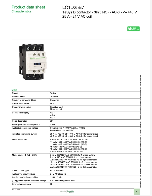 แมกเนติก คอนแทคเตอร์ - Schneider Electric - รุ่น TeSys Deca (TeSys Control Deca) - ต่อแบบ DOL (Direct On line : โดยตรง) - 3 poles (3P) - พิกัดกำลังไฟฟ้า 11kW (ที่ 380-415Vac; AC-3) - พิกัดกระแส (440vac; AC-3) 25A - ไฟเลี้ยงคอยล์ 24VAC (50/60Hz) - คอนแทคเสริม 1NO+1NC